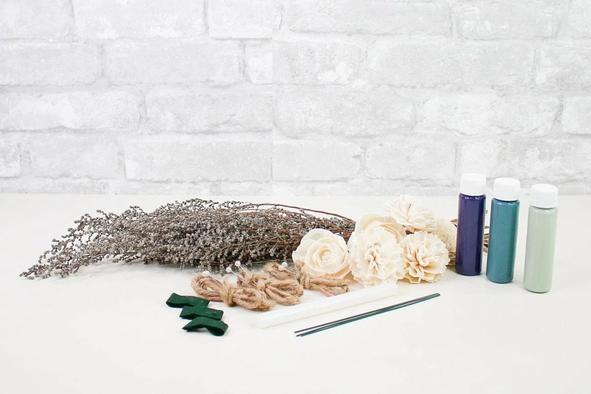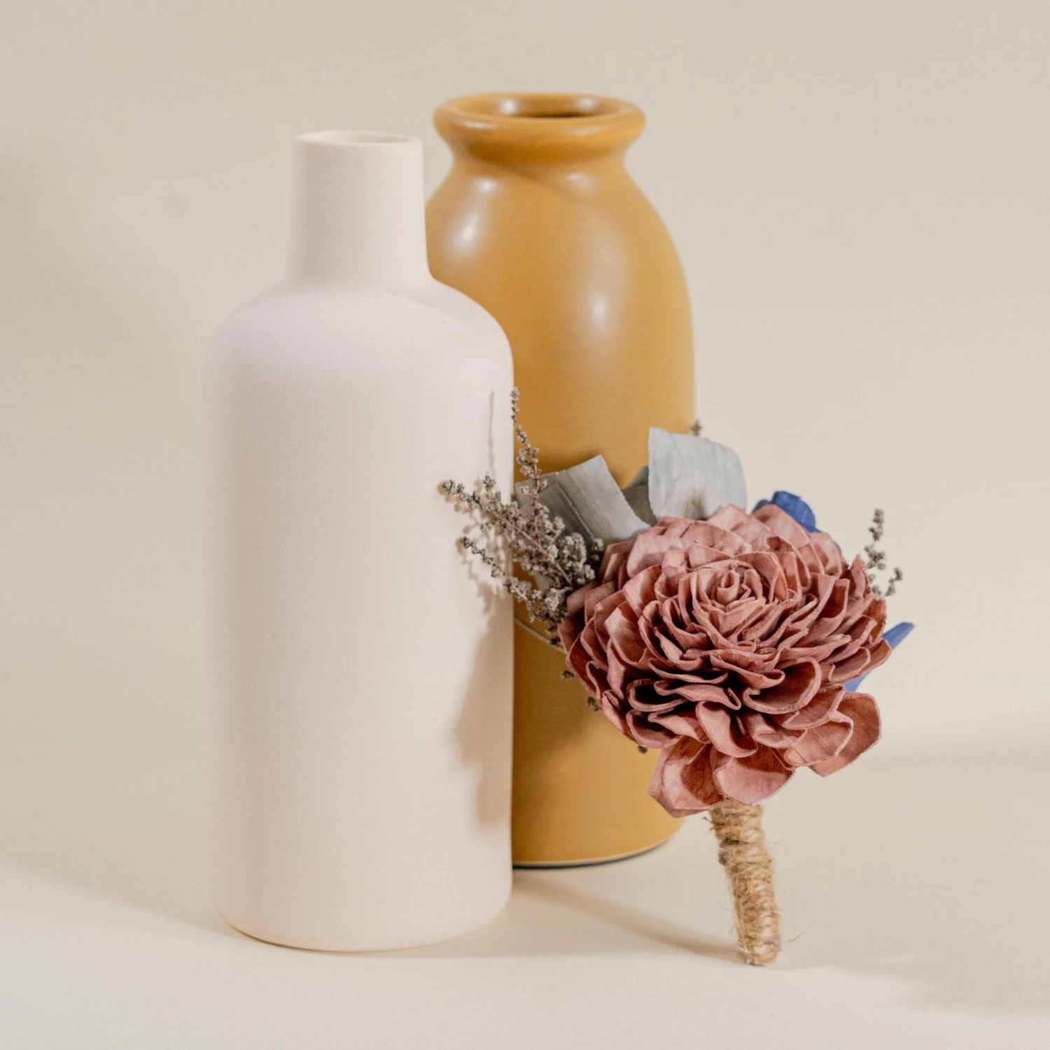 This boutonniere kit includes everything you need to create a 3 beautiful boutonnieres. You can choose from our 50+ color options and dye as many, or as few, flowers as you would like. The silver caspia filler is perfectly paired with our sola wood flowers for a glamor themed arrangement. We chose to go with a few classic colors for our arrangement, but the neutral filler is sure to compliment any color scheme you’re working with!