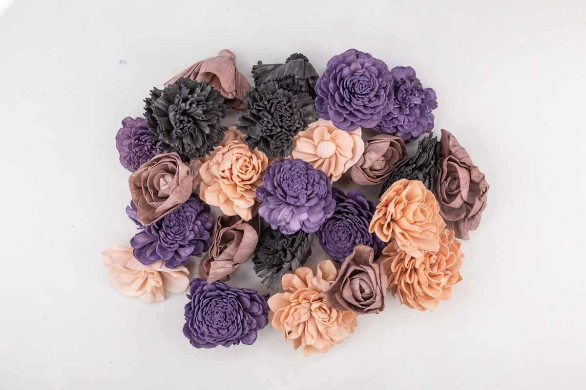 In this assortment you will receive a variety of sola wood flowers flowers ranging in size from 2″ – 3″. The colors used in this assortment are Powder Pink, Mauve, Frosted Mulberry, and Grey.