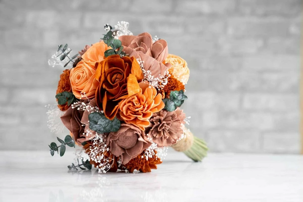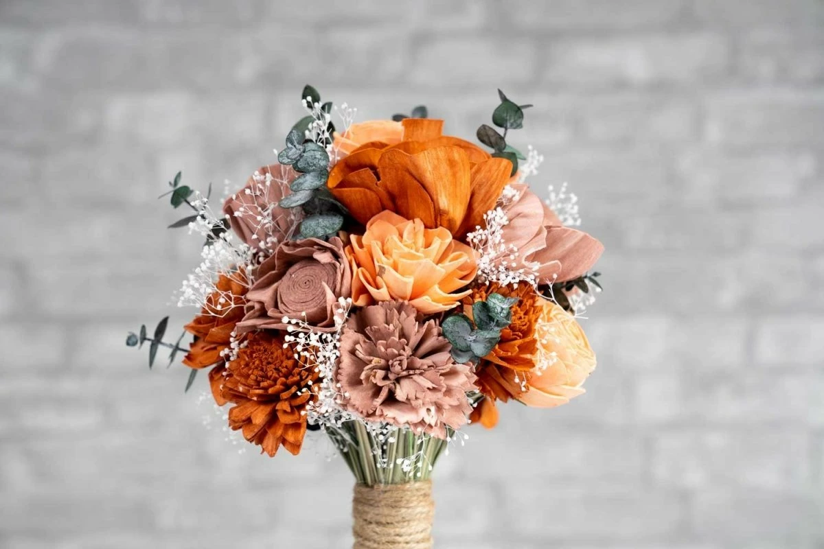 The bouquet is made of our gorgeous Satin Washed Eucalyptus, White baby’s Breath greenery/filler and best selling sola wood flowers dyed in colors Terracotta, Coral and Mauve.