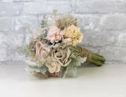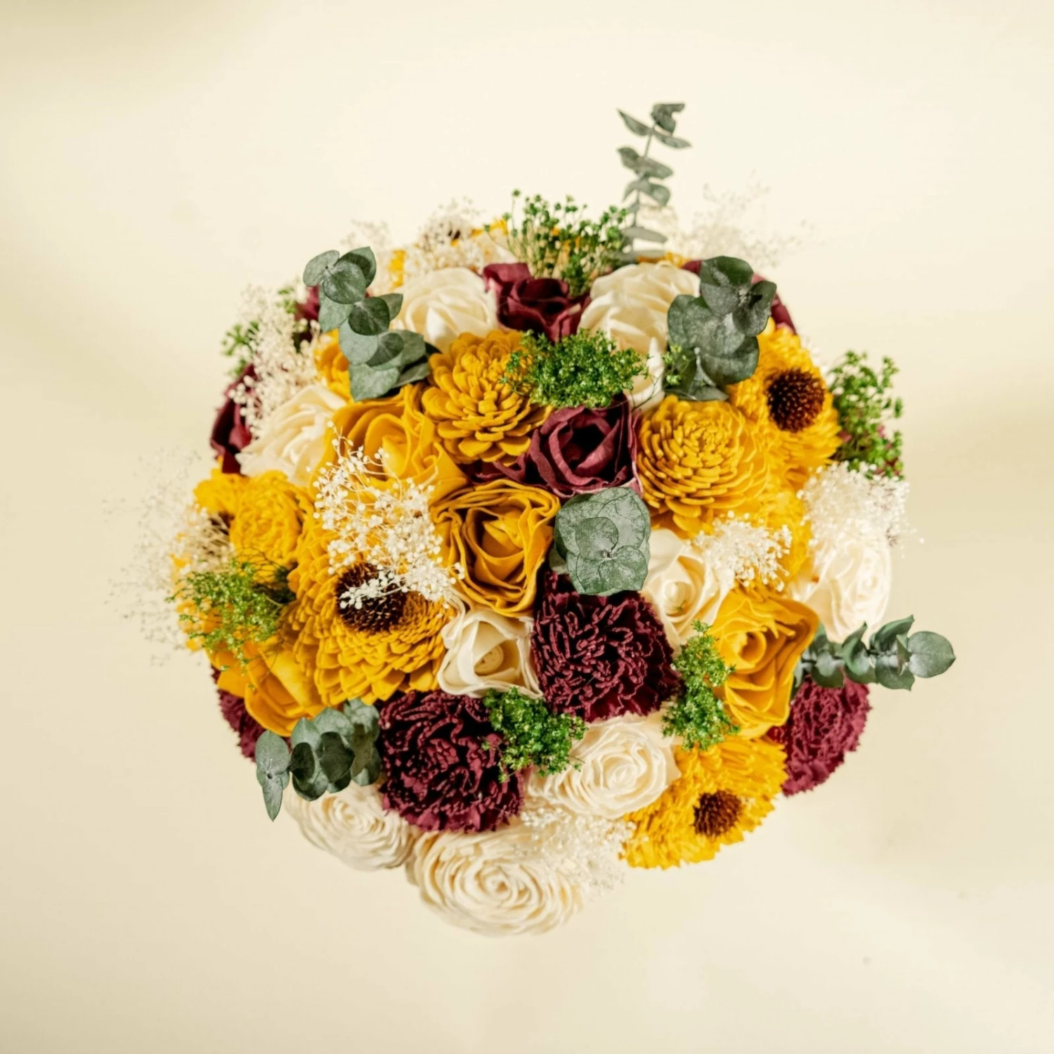 This bouquet is an absolute beauty. The beautiful assortment of sola wood flowers dyed in the colors Mustard, Merlot, and Raw (No Dye) is perfectly paired with our most popular preserved fillers Green Mini Gyp, Kelly Green Frosted Eucalyptus, White Baby’s Breath giving this bouquet a larger than life look!